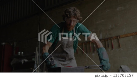 Heating metal plate, metalworker in coveralls aiming blowtorch flame in shop, with digital overlay