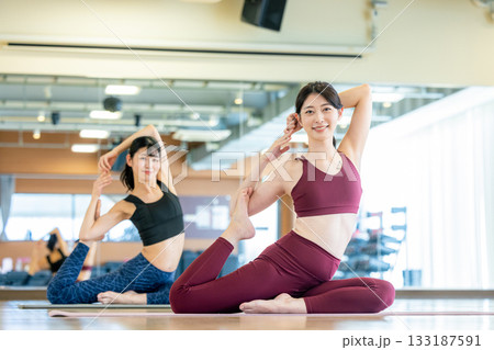 ヨガスタジオでヨガレッスンを受ける若い日本人女性