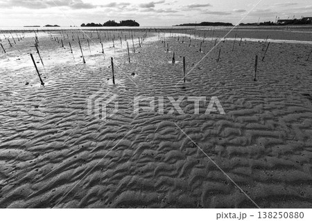 恩納村の海で朝日に照らされ輝く砂地とアーサの養殖場と砂紋 モノクロ