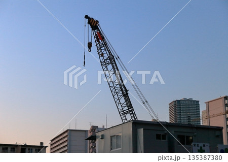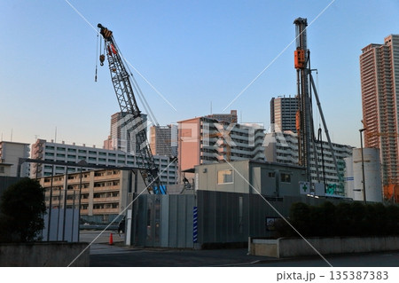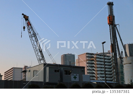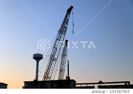 建設現場 夕焼けと杭打機クローラマウント三点式パイルドライバ