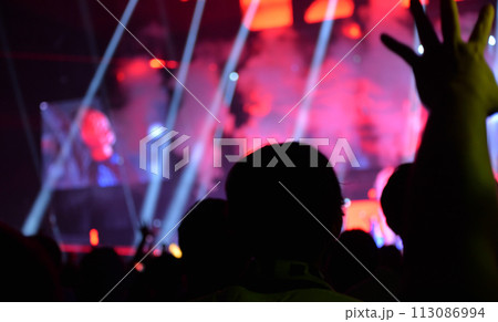 マイクを持って歌う女性アイドルシルエットとスポットライト_ワイド