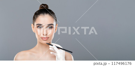 A young woman with a clean look is having makeup applied by a professional artist. The artist is using a brush and wearing gloves, indicating a hygienic approach, against a plain gray background.