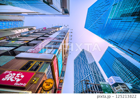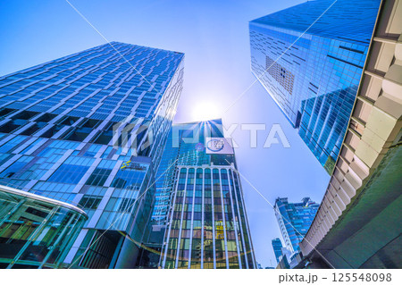 日本の東京都市景観 夏のような暑さ…渋谷のビル群…窓ガラスに映り込む摩天楼。渋谷・万華鏡都市
