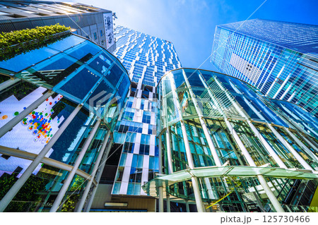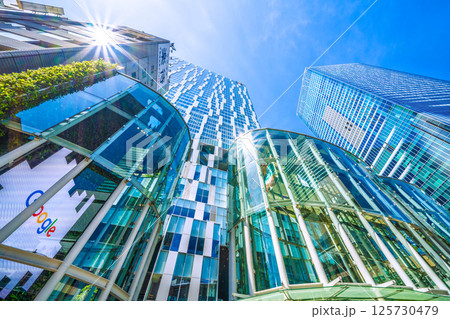 日本の東京都市景観“夏”空… 渋谷のビル群…窓ガラスに映り込む摩天楼。渋谷・万華鏡都市…躍進の時代へ