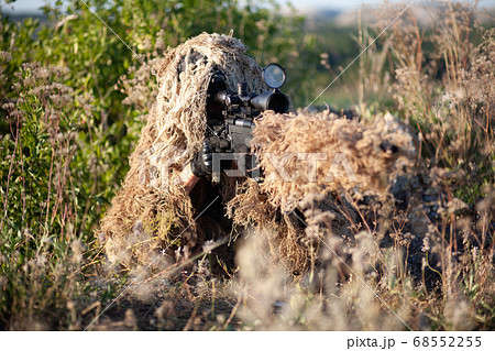sniper in ghillie suit with precision rifle with