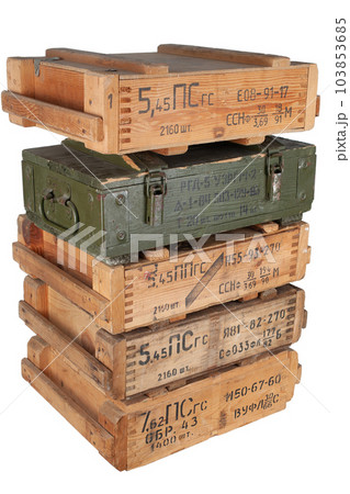 Army ammunition stack of wooden crates. Text in russian - type of ammunition, projectile caliber, projectile type, number of pieces and weight.