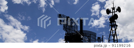 Air defense radars of military mobile anti aircraft systems, modern army industry on background beautiful clouds and sky, Russia