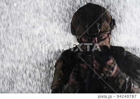 Army soldier in Combat Uniforms with an assault rifle, plate carrier and combat helmet going on a dangerous mission on a rainy night.