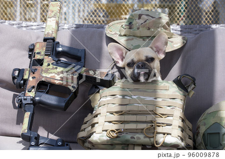 A French bulldog lies in the shade behind a bulletproof vest next to an airsoft machine, looking at the camera. Sunny day and hard shadows on the bench.