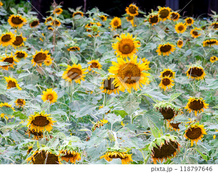 真夏の景色 満開のヒマワリにとまるかわいいツマグロヒョウモン蝶