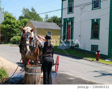 ルーネンバーグ旧市街の馬車馬の世話をする女性