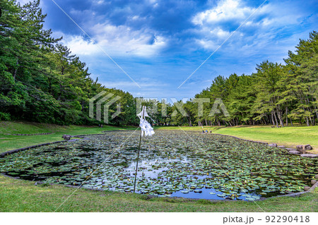 睡蓮の黄色い花が咲くみそぎ池の風景
