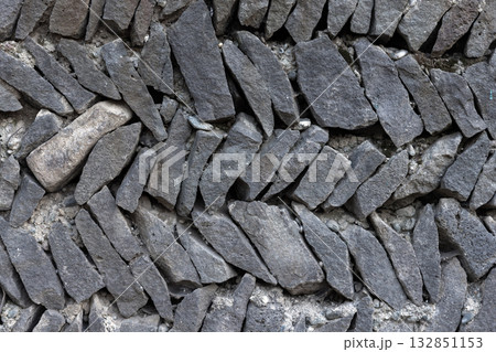 Close-up of a stacked, dry-stone wall built from irregular dark gray rocks.