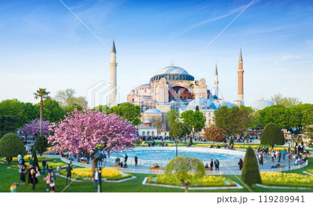 Sultanahmet district in Istanbul, Turkey. Walking people, green grass fields and fountain near famous landmark Hagia Sophia. Bottom of photo is blurred.