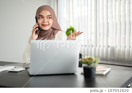 Confident Asian Muslim businesswoman is dealing business with her client over the phone at her desk