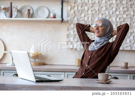 A young woman in hijab of oriental origin is sitting at home in the kitchen using a laptop and listening to music in headphones. Raising his hands up, he dances, rests, relaxes.
