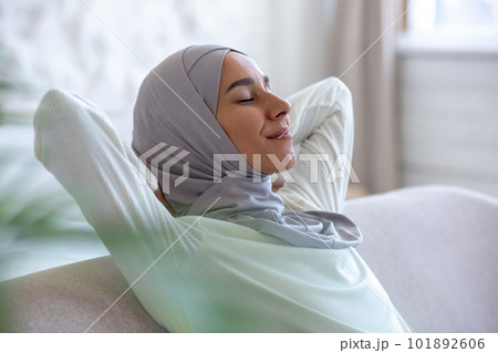 Young muslim woman resting at home with eyes closed hands behind head napping sitting on sofa, woman in hijab close up in living room.