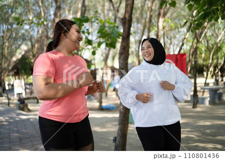 A Muslim woman wearing a burqa resting with a woman with disability after a hard training session on the marathon course