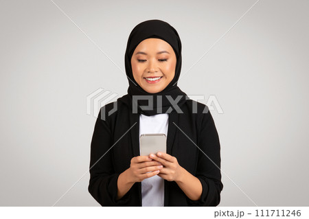Happy young Muslim woman in a hijab and blazer looks at her smartphone with a pleased expression