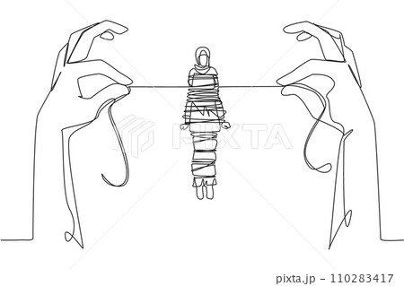 Single one line drawing Arab businesswoman standing and tied by rope held by 2 giant hands. Used as business collateral. Trapped in debt. Failed miserably. Continuous line design graphic illustration