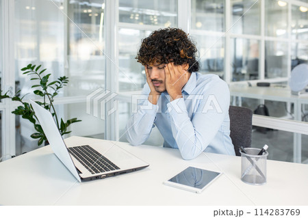 Young businessman with curly hair feeling stressed and tired while working at his laptop in a modern office setting. Concept of job pressure and mental health in corporate environments.