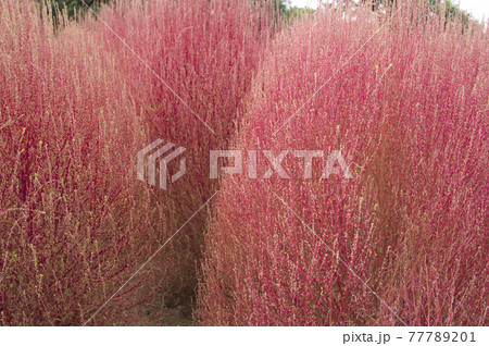 公園のコキアが赤色に紅葉しています。 学名はBassia scopariaです。