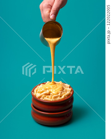 Mac and cheese with melted cheddar cheese, isolated on a blue background
