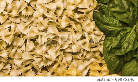 Dry Butterfly pasta with different flavors on a wooden background. Multi-colored pasta with spinach