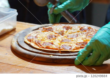 A person wearing green gloves is cutting thin-crust, small-size pizzas on a wooden tray with a pizza cutter.