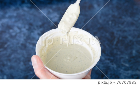 Hand scooping vibrant yellow mango gelato in a container, close-up food preparation