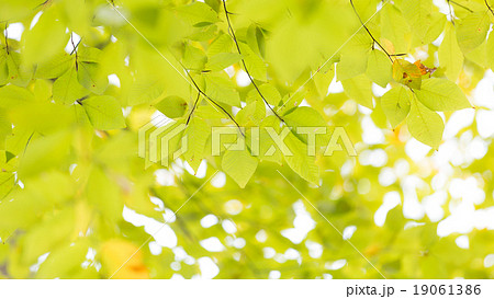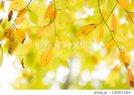 自然 植物 イヌシデ、晩秋の雑木林。陽射しを通して見る黄色や緑の葉が美しい