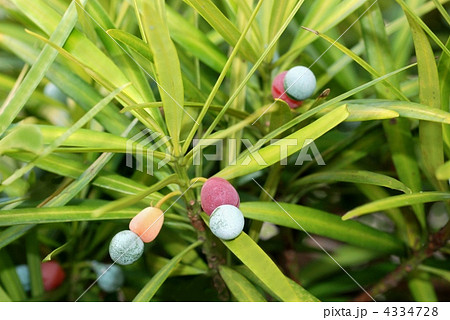 カラフルな色のイヌマキの実(秋、十月)