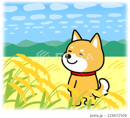 ひつじ雲と黄金色に輝く田んぼの中に佇むしばいぬ