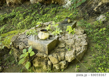 拝所の香炉 シキヨダユル・アマダユルの壺 沖縄の斎場御嶽