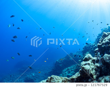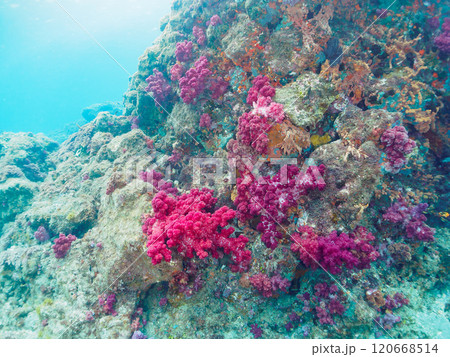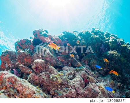 美しいアカハタ、ソラスズメダイ他の群れウミトサカ、イボヤギ他のソフトコーラルが群生する岩礁 ヒリゾ浜