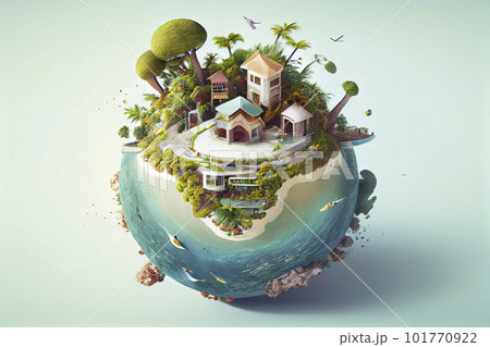 Personal resort on little planet. Concept for travel, holiday, hotel, spa, resort design. Tiny island / planet collection