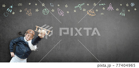 Kid in pilot costume and imagination dream in learning inspiration world in innovative science technology engineering maths STEM education and universal children's day concept
