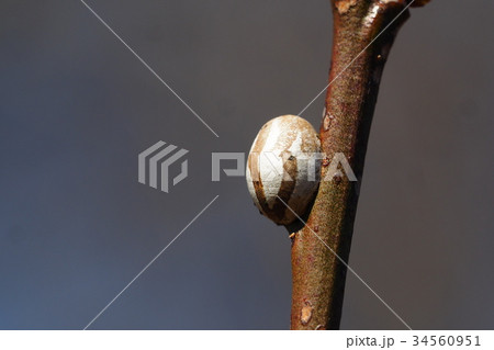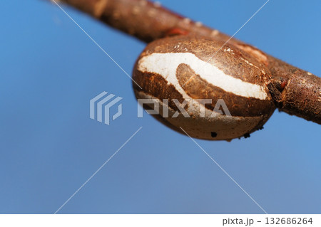 木の枝に固着したイラガの繭