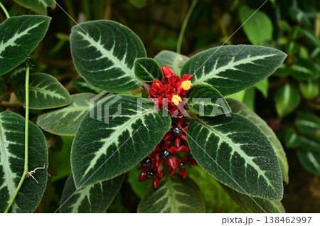 Colorful tropical foliage plants fittonia maranta and episcia growing together in humid garden display with textured leaves and vibrant patterns