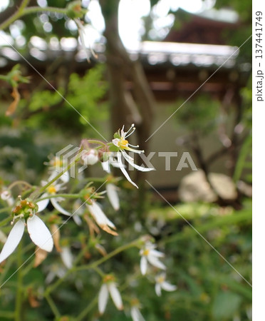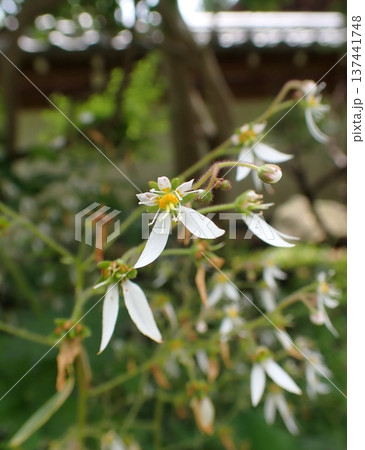 公園の片隅に咲いたユキノシタ の花のクローズアップ(花とつぼみをつけたイドクサ)