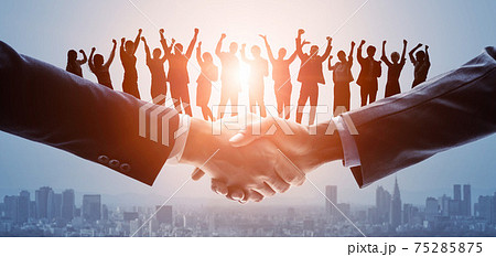 握手するビジネスパーソンと多国籍の人々のネットワーク