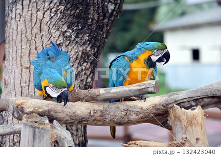 動物園のふれあい広場の止まり木にとまる2羽のベニコンゴウインコのいる風景