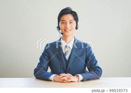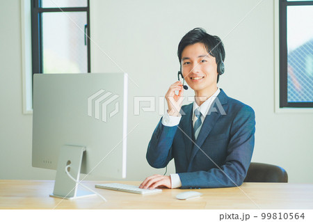 ヘッドセットをつけてインサイドセールスをするスーツ姿の若い男性