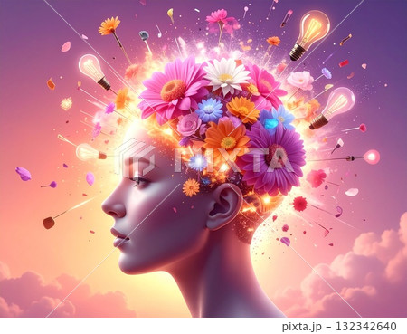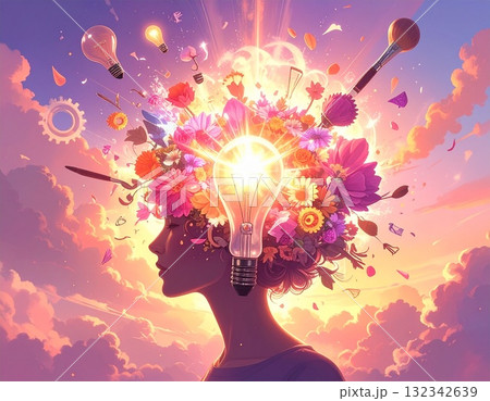 創造力が花開くイラスト|頭の中から光と花びらが広がるクリエイティブな発想の象徴アート