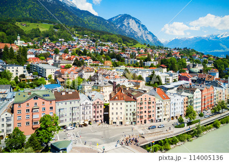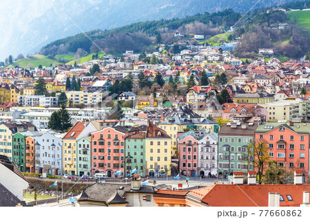 Aerial view of colorful buildings and mountains of Innsbruck, Austria