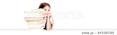 Young cute girl sitting at the table and reading a book