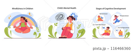Child cognitive development set. Process of kids intelligence, creativity and personality formation. Studying technique, primary school education system. Flat vector illustration