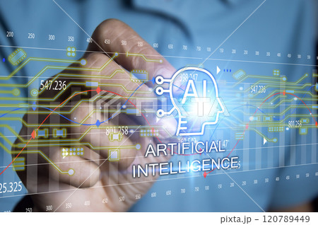 AI generated image of person holding glowing virtual AI interface with futuristic icons representing technology data security cloud innovation and smart connectivity