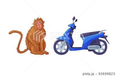 Brown Sitting Monkey and Motor Scooter as Bali Traditional Cultural Attribute Vector Set