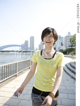 ポータブルオーディオで音楽を聴く若い女性